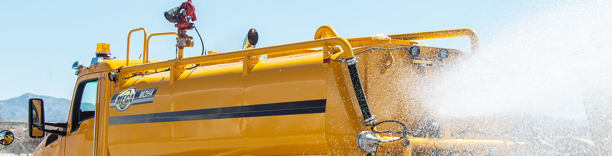Mega offers two hydraulically-actuated dump bars. Mega's pressurized dump bar sprays penetrating jets of water directly onto the ground. The gravity dump bar is fed directly from the bottom of the water tank and may be used with the water pump turned off to reduce water flow and pressure.